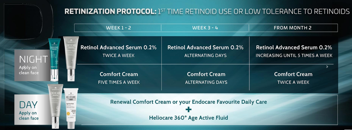To begin with, give the tube a good shake before each use. Then, gently apply Endocare Renewal Retinol Intensive Serum to the face and neck in the evening. Avoid contact with eyes and mucous membranes when applying. Use a high SPF sunscreen the following morning. With this high concentration of retinoids, your skin may need a progressive adjustment. Start by applying a few times a week and progressively increase the number of applications.