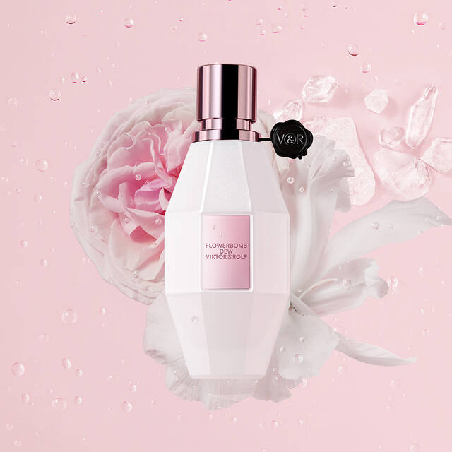 Flowerbomb Dew unveils a new time in the Flowerbomb garden with a bouquet floral of a new kind, the one picked from the first morning dew. A bomb of softness like a second skin of flowers fresh in a bottle with a white dress subtly pearly and dewy transparent.