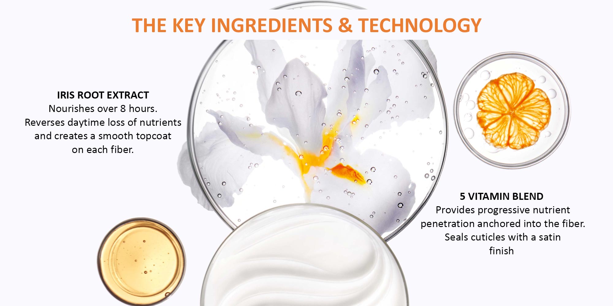 • Iris Root extracts: Nourishes progressively & durably over 8h (reverses daytime loss of nutrients & creates a beautiful coat on fibre).
